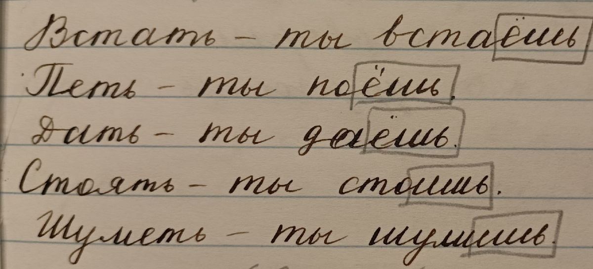 1. Проверка домашнего задания. 2. Актуализация знаний и объявление темы урока. - Что называется глаголом? - Как изменяются глаголы? - Что такое спряжение? На доске записаны глаголы из упр. 231: Встать- Петь- Дать- Стоять - Шуметь - Изменить глаголы в форму 2 лица единственного числа (представьте местоимение ты): Встать - ты встаёшь. Петь - ты поёшь. Дать - ты даёшь. Стоять - ты стоишь. Шуметь - ты шумишь. - Какие окончания у этих глаголов? Сегодня мы начинаем учиться писать окончания глаголов 2 лица единственного числа. 3. Работа по теме урока. Откройте учебник на стр. 69 и прочитайте правило. - Какие окончания имеют глаголы 2 лица единственного числа? - Что пишется на конце? Это правило нужно запомнить. Упр. 232. Прочитайте текст. Замените местоимение Я на местоимение ТЫ. Прочитайте текст снова. Как изменились окончания глаголов? Спишите получившийся текст. Выделите окончания - ешь, - ишь. Определите спряжение. 4. Домашнее задание. Выучить правило на стр. 69. Упр. 233. Выписать глагол