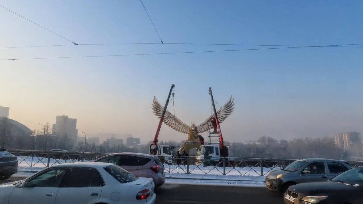 Светодиодную композицию в виде сказочной птицы начали монтировать напротив кемеровского цирка. Размах крыльев около 11 метров, высота композиции - почти 8 метров. Конструкция представляет собой металлический каркас с закреплёнными на нём светодиодами, от которых исходит свечение разной температуры. Благодаря этому переливаться фигура будет оттенками как тёплого, так и холодного света. Раньше на месте новой фигуры стояла конструкция в виде шаров, однако её демонтировали. Это из паблика Было так