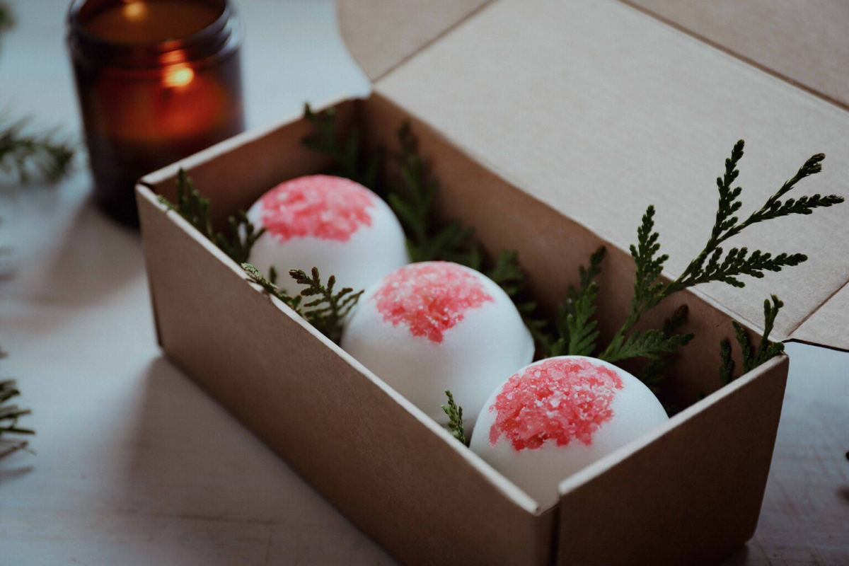 В коробку с гейзерами я положила сухие веточки туи, вы можете использовать любые сухоцветы в качестве декора (свежие веточки могут оставлять на бомбочках пятна).