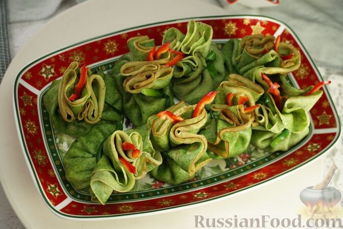 Блинные мешочки от Деда Мороза. Закуска "Цветочек" с курицей и овощами. Морской коктейль в сливочно-соевом соусе. Пирожные с повидлом и глазурью. Фрикадельки с сыром и лимоном. Салат-закуска с курицей, картофелем, огурцами и сыром смотрится очень эффектно. Закуска из отварного куриного филе, овощей, яиц, сыра и майонеза формируется в виде шариков, которые покрываются измельчённой зеленью, отварной морковью и свёклой. Морской коктейль с овощами в сливочно-соевом соусе. Мягкий вкус морепродуктов хорошо раскрывается при тушении со сливками и соевым соусом. Стручковая фасоль и помидоры черри гармонично дополняют композицию. Базилик и цедра лимона добавляют аромат. Бисквитные пирожные с повидлом, глазурью и орехами. Воздушный бисквит отлично сочетается с кисло-сладким повидлом и глазурью из растопленного шоколада. Орехи используются для украшения и придают пирожным завершенный вид. Мясные фрикадельки с сыром и лимоном. Особенность этих фрикаделек – лимонная цедра в фарше и лимонный сок, до