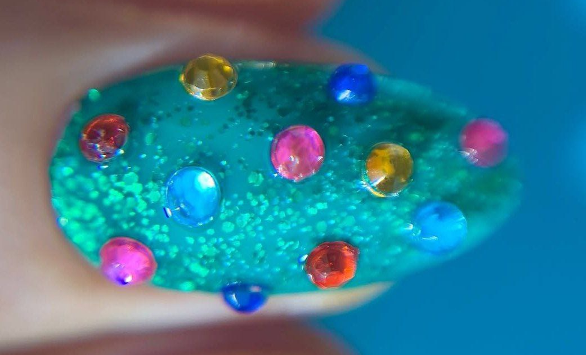 Популярный нейл-дизайн – цветные стразы-шарики, симметрично украшающие ногти. Выбирайте объемные стеклянные стразы-полусферы: они продаются в косметических магазинах и на маркетплейсах.