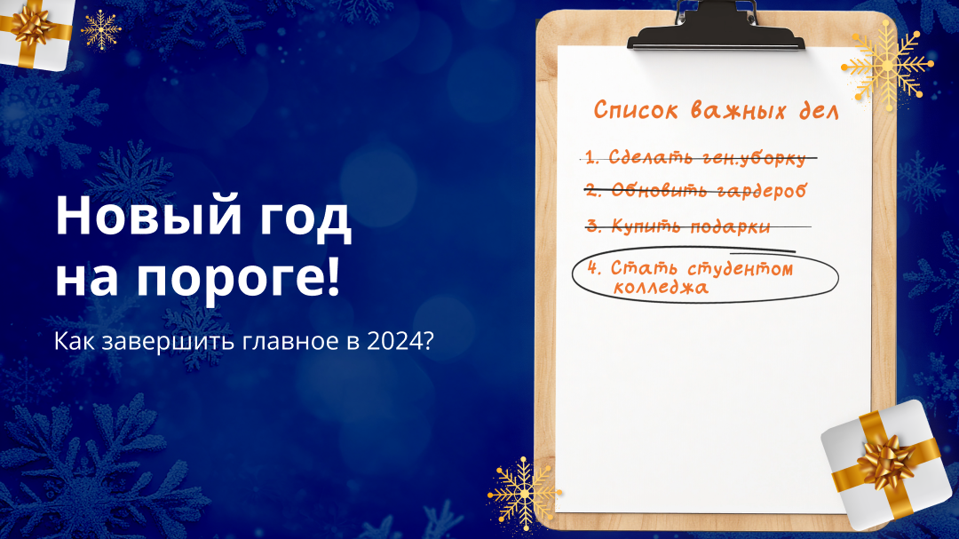 Декабрь — время подводить итоги. Кто-то радуется, что все успел. А кто-то сокрушается: «Ну вот, снова откладываю важные дела на потом». И одна из таких задач — образование. Если столкнулись с подобной проблемой, не стоит отчаиваться. Шанс исправить ситуацию есть! Сделайте три шага и завершите начатое уже сегодня. Планировали поступить, но что-то пошло не так? Иногда сомнения берут верх: «Наверное, это не для меня», «Уже слишком поздно начинать». Путь к новой жизни кажется таким долгим и тернистым. Возможно, вы уже откладывали планы и теперь, глядя на календарь, чувствуете, что снова опоздали. Но давайте честно: сколько раз вы начинали и бросали? Сколько раз думали, что «это слишком сложно» или «я недостаточно хорош»? Знакомо? Не переживайте — вы не одиноки. Так бывает на пути к переменам. Не ругайте себя за прошлые ошибки. Важно не то, что было, а то, что вы решите сделать сейчас. Даже в декабре, перед самым финалом года, можно закрыть вопрос с образованием, который вы так долго отклад