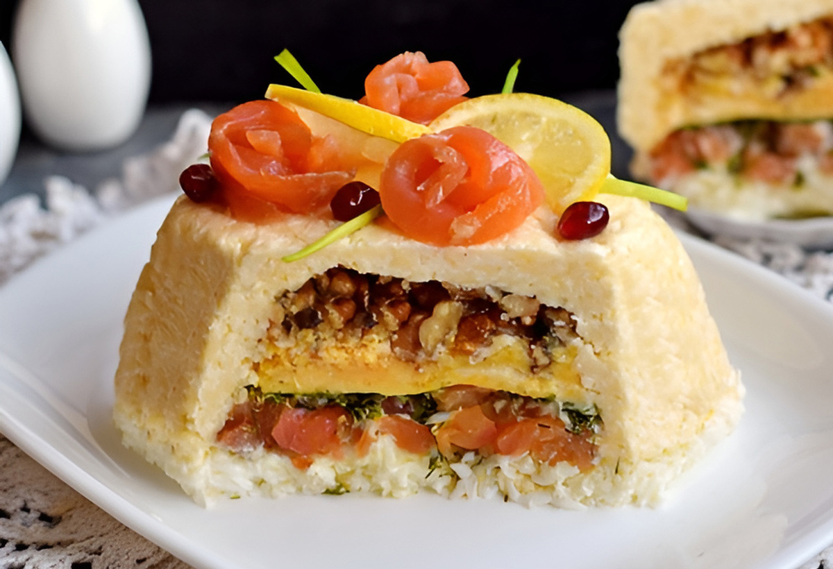 По мнению менеджера Софии Борлаковой, этот салат не только оригинальный и красивый, но и очень вкусный. А еще его без труда можно нарезать на ровные и красивые порционные куски. Чем не вариант для новогоднего застолья? Ингредиенты: 200 г филе красной рыбы (слабосоленой), 5 куриных яиц, 250 г сыра, 60 г рубленых грецких орехов, небольшой пучок укропа, 15 г желатина, 75 мл воды, 7-8 ст. л. натурального йогурта без добавок (или майонеза). Сыр трем на мелкой терке, добавляем половину йогурта и желатин, разведённый в тёплой воде. Хорошо размешиваем сырную массу и выкладываем ее на дно квадратной или прямоугольной формы (например, для выпечки кекса), предварительно накрытой плотным и ровным слоем пищевой пленки по дну и бокам. На дно формы с сырной массой выкладываем рубленые грецкие орехи. Покрываем этот и все последующие слои сеточкой майонеза или йогурта. Вареные яйца разделяем на белки и желтки, натираем их отдельно друг от друга на мелкой терке. Первыми выкладываем желтки. Потом идет сл