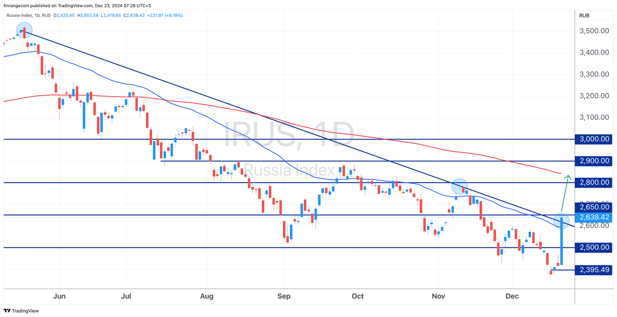Индекс МосБиржи продемонстрировал одно из самых сильных дневных движений за последние годы. Причины такого движения кроются в: – неожиданном решении ЦБ, – низкой ликвидности на рынке, – массовом закрытии шортов и срабатывании стоп-лоссов. В результате многие акции сформировали двойное дно, пробили долгосрочные линии нисходящего тренда и важные уровни сопротивления на повышенных объёмах. Что дальше? – Ожидаю положительной динамики российского фондового рынка до 20 января 2025 года – инаугурации Трампа. Сейчас будут разгонять рынок новостями о переговорах, уже на выходных Трамп снова заявил о готовности встретиться с Путиным. – Те, кто упустил пятничный рост, начнут выкупать каждую коррекцию. Клиенты будут звонить инвестконсультантам и просить покупать акции. FOMO работает на всех одинаково. Профессиональные участники рынка будут перестраивать стратегии и ребалансировать портфели. В связи с вышеперечисленным, не исключаю роста индекса МосБиржи в ближайшее время до 2800-2900 пунктов. Знач