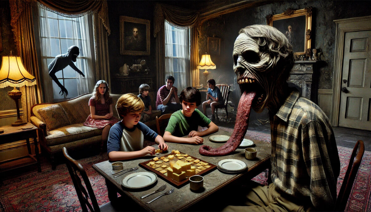 Тётя Эми повернулась к нам с Меган. «У нас нет времени. Садитесь за стол в гостиной с Робертом и Гэри и играйте в ту настольную игру, которую они уже разложили. Мы будем на кухне готовить ужин. Сосредоточьтесь на игре и не смотрите на него. Старайтесь вообще на него не смотреть, даже если он подойдёт близко. Поняли?»