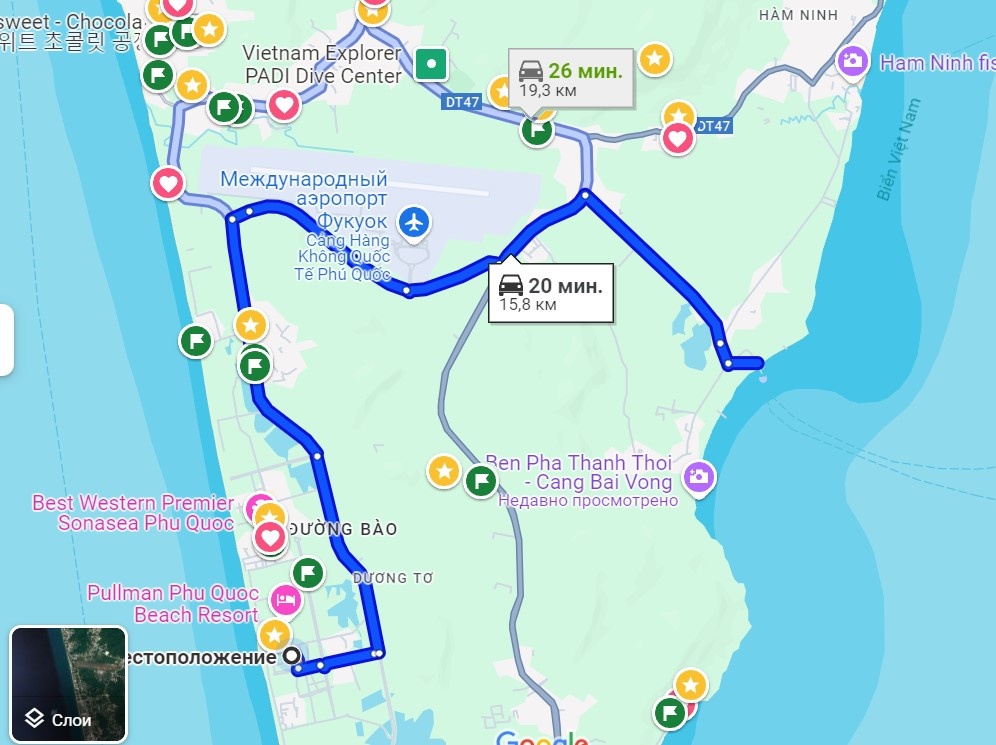 Карты показали нам, что ехать надо на восточное побережье 16 км. Но мы знаем более короткий путь, на 2 км короче:).