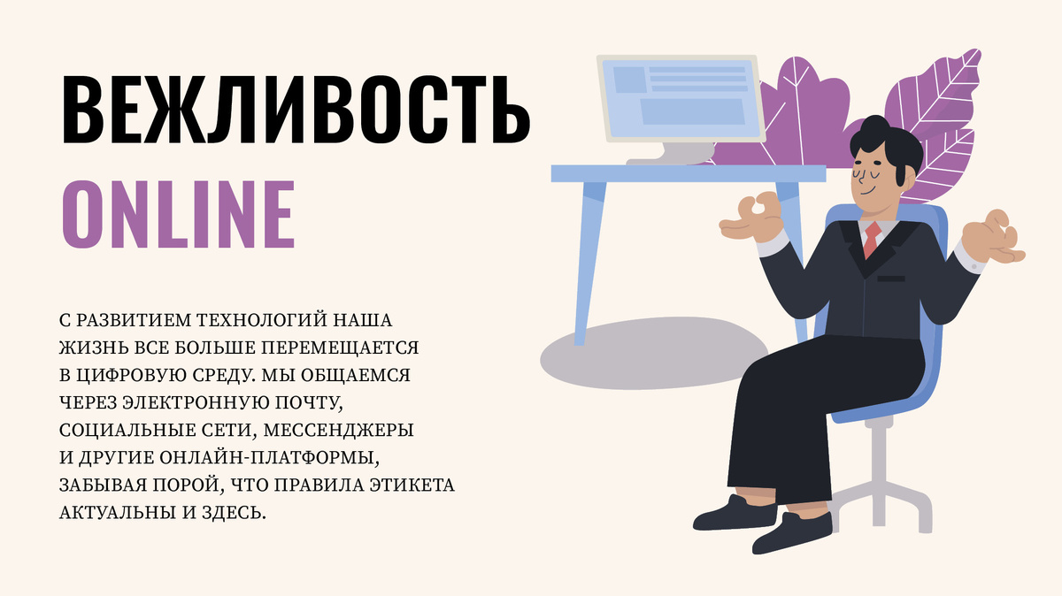 С развитием технологий наша жизнь все больше перемещается в цифровую среду. Мы общаемся через электронную почту, социальные сети, мессенджеры и другие онлайн-платформы, забывая порой, что правила этикета актуальны и здесь. Нетикет включает в себя свод правил и рекомендаций, которые помогают сделать онлайн-общение уважительным и продуктивным. Следование правилам цифрового этикета способствует созданию позитивной атмосферы, укреплению деловых отношений и поддержанию личных связей. Невежливое поведение в Сети, напротив, может привести к недопониманиям, конфликтам и даже репутационным потерям. Общие принципы цифрового этикета — Будьте вежливыми и относитесь с уважением к собеседнику. В цифровом мире это правило не утрачивает своей важности. Уважение проявляется в учтивом обращении, корректном тоне и внимательности к деталям. Всегда начинайте сообщение с приветствия и завершайте прощанием. — Четкость и ясность также имеют большое значение. Поскольку при онлайн-общении отсутствует невербальн