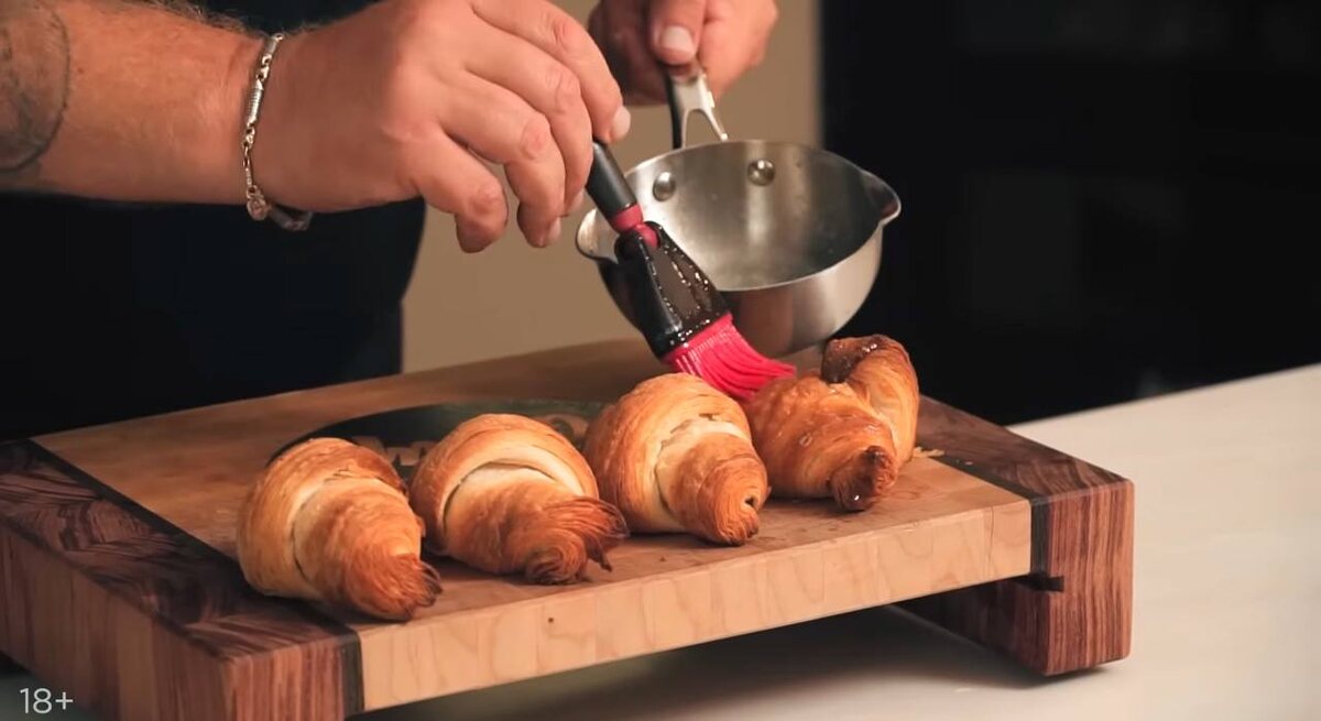 Нарезаем слоёное тесто на треугольники. В центр каждого треугольника кладём начинку (шоколад, мармелад или другую — по вкусу) и сворачиваем в рулет, формируя круассан. Для дрожжевого теста даём заготовкам немного подойти перед выпечкой. Смазываем растопленным сливочным маслом. Выпекаем в разогретой до 200°C духовке 15-20 минут. Готовые круассаны по желанию украшаем сахарной пудрой.