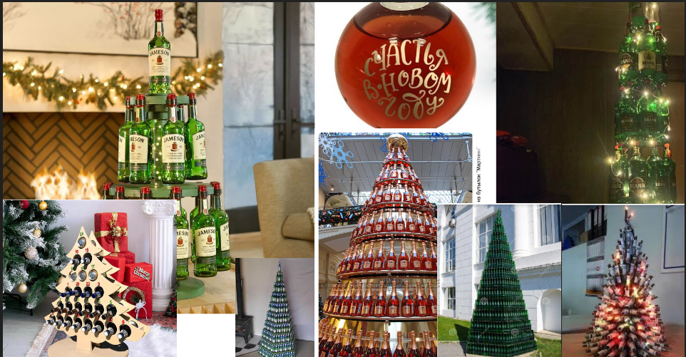 Новый год — время волшебства и творчества! Если вы хотите сделать праздник ещё более уютным и индивидуальным, почему бы не создать собственную ёлку своими руками? Вот пять интересных вариантов, как можно оформить этот символ праздника без покупки традиционной ёлки. Для этой ёлки вам понадобятся бутылки, лучше всего — из-под вина, шампанского или другого алкоголя. Используйте специальные крепежи для бутылок, чтобы создать структуру ёлки или можете просто составить их пирамидкой как на фото. Бутылки можно покрасить в зелёный цвет или оставить прозрачными, украшая их гирляндами, бантиками, шишками или блёстками. Такая ёлка будет не только креативной, но и станет прекрасным украшением для любителей весело праздновать новый год. На вверх ставте те напитки, которые вы планируете пить первыми, а снизу то, что должно остаться на последок. Не беспокойтесь о том, что елка будет пустеть, ведь пустые бутылки можно вернуть обратно на главное украшение дома или квартиры. Простой, но эффектный вариа