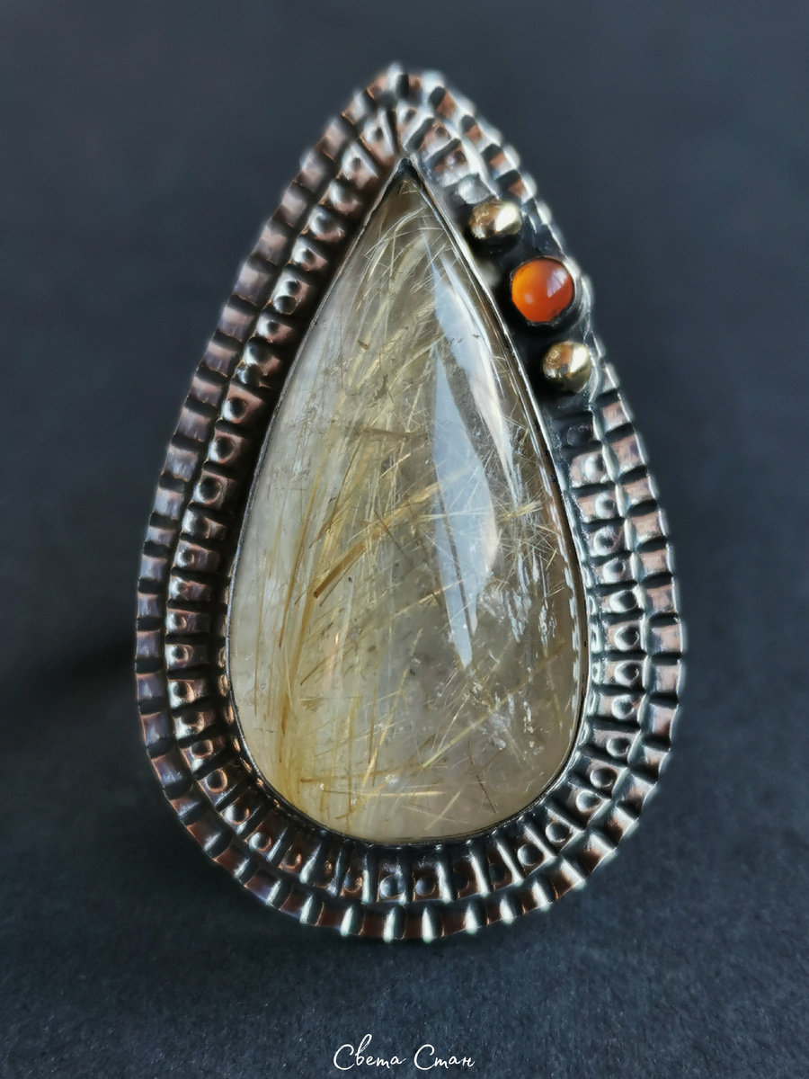 Внезапная новинка. Перстень рождался параллельно с другими работами, как-то незаметно и так легко, что аж неожиданно) я допиливаю последний заказ в этом году, а этот красавчик уже готов украшать чей-то пальчик❤️ молодец какой😁 Этот рутиловый кварц шикарен, "волосатость" на хорошем уровне, золотые линии блестят особенно на солнышке. Кварц "волосы Венеры", сердолик, нейзильбер, латунь. Длина оправы 3,5 см, размер шинки регулируется. Полностью ручная работа.