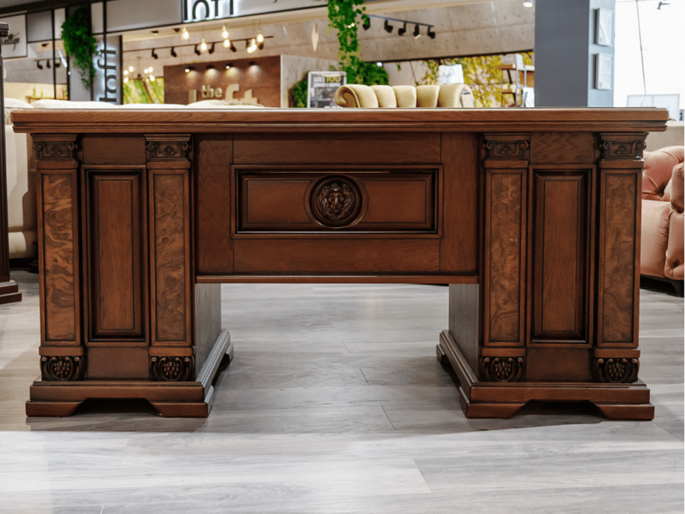 7. По желанию заказчика стол декорируется эксклюзивной резьбой (вставка «лев») и вставками из натурального корня ореха. Эти детали придают столу статусность и роскошный внешний вид.