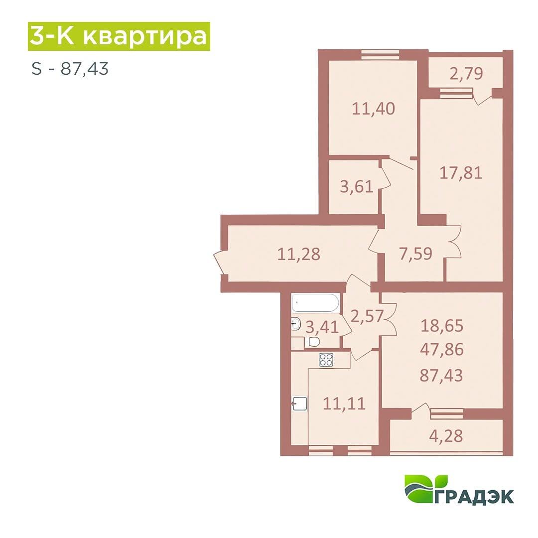 Открывайте горизонты комфортной жизни в ЖК «Европейский» с нашей 3-комнатной квартирой, имеющей общую площадь 87,43 м². Эта планировка создана для тех, кто ценит уют и функциональность: идеально подходит как для семьи с ребенком, так и для семьи с двумя детьми.