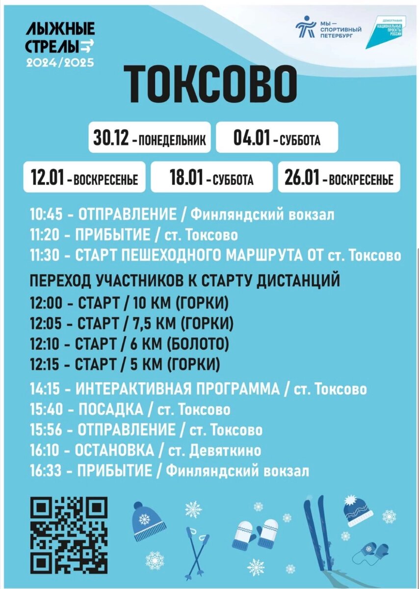 открывается сезон с 29 декабря 2024 года. Бесплатное мероприятия которое проводится ежегодно. Бесплатные электрички в Шапки и Орехово. Это мероприятие для тех кто любит кататься на лыжах, выезжать за город, проводить весело время, там будет для лыжников трасса 5, 10, 15 км, инструктор котрый подскажет направление, для тех кто не катается на лыжах можно отдохнуть на природе, также там будет полевая кухня и можно будет поучаствовать в культурной программе. Бесплатный билет можно получить на сайте rzd.kassir.ru Также группа в вк для информации: Ссылка на государственный комитет по Культуре и спорту