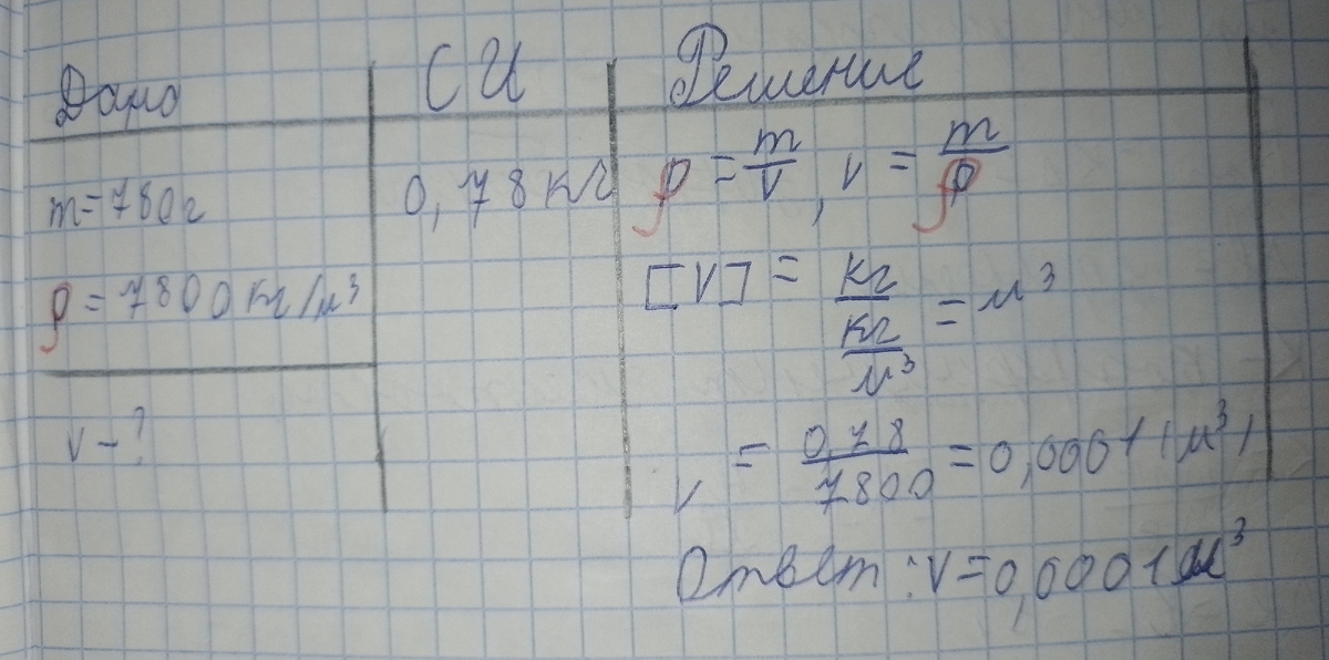 Стальная деталь имеет массу 780 грамм. Определите её объём.