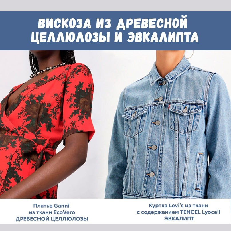 🪵 EcoVero ВИСКОЗА ИЗ ДРЕВЕСНОЙ ЦЕЛЛЮЛОЗЫ - это вид вискозы, изготовленный с использованием древесины из контролируемых источников. Он выпускается в Австрии компанией Lenzing, признанной одним из лучших производителей вискозы в мире за практику устойчивого развития. EcoVero может быть настолько гладким и нежным на ощупь, что иногда напоминает шелк. Вискоза воздушна, что делает ее подходящей для блуз и летних платьев. Кроме того, структура целлюлозных волокон ткани позволяет регулировать поглощение и выделение влаги, придавая дополнительную воздухопроницаемость и поддерживая терморегуляцию тела. 👉 Эту ткань можно встретить в коллекциях таких брендов, как: J.Crew, Ganni, Monsoon и других. 🍃TENCEL Lyocell ВИСКОЗА ИЗ ЭВКАЛИПТА - мягкое и достаточно прочное волокно, получаемое по особой технологии из органического сырья. Ткань является достаточно популярной в мире экологичной моды - среди ее поклонников числятся Asos, Levi’s, Patagonia и The North Face. EcoVero и TENCEL Lyocell - очень