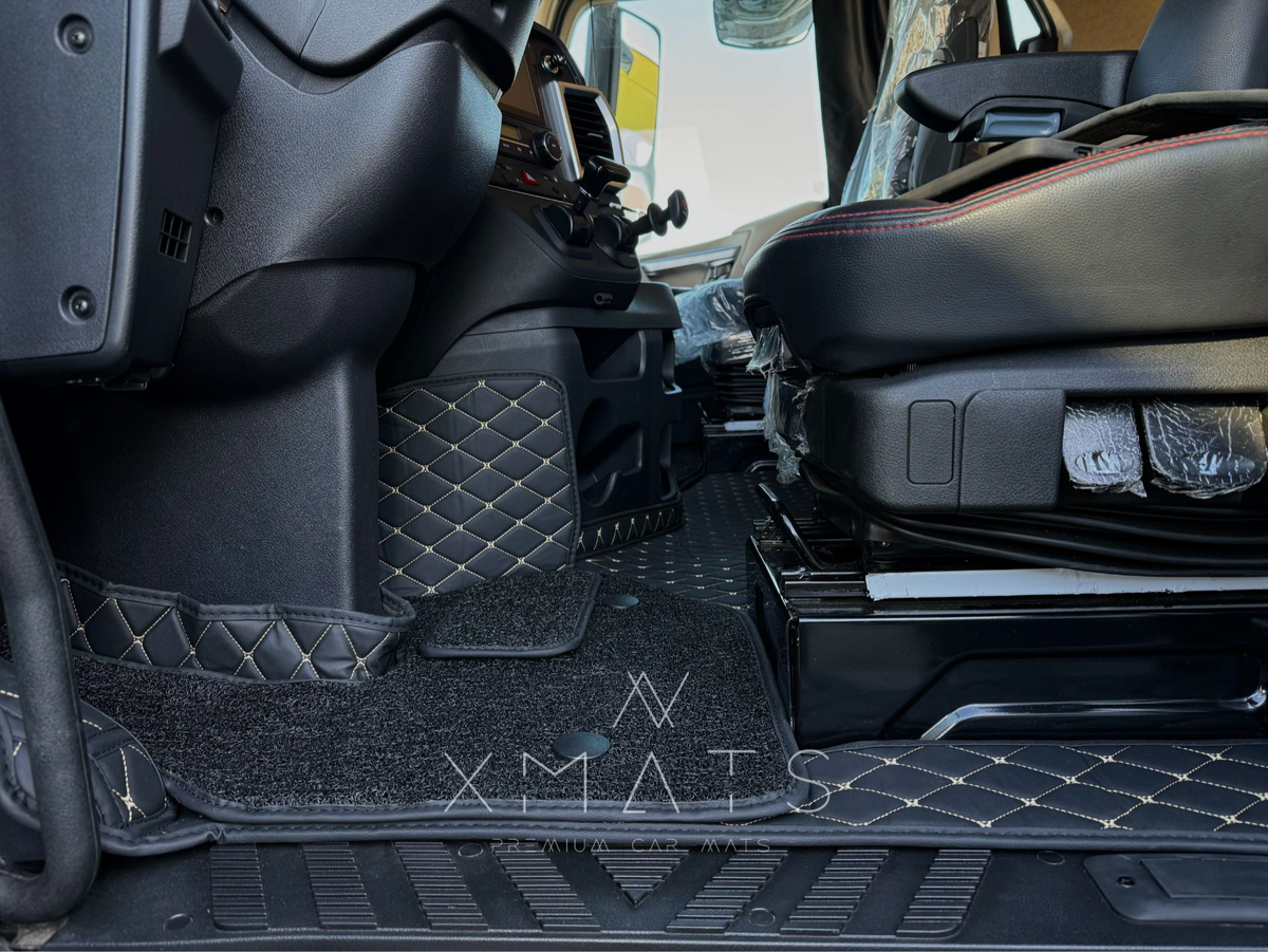 Сегодня в нашем ателье побывал тягач JAC K7. Покажем вам промежуточный результат работы. Первым этапом мы провели замеры, после отшили первый комплект и примерили его. Создание лекал с нуля – обычная практика для ателье XMATS, именно поэтому коврики идеально прилегают и полностью соответствуют конфигурации кузова. После примерки мы внесли корректировки уже на готовом изделии, исправили и установили. В ходе примерки учли ещё один недочет – так бывает, когда автомобиль совершенно новый и ранее мы не изготавливали комплект ковриков на него. Однако, теперь у нас есть точные лекала на JAC K7, и мы уверены, что они будут на 100% соответствовать вашим ожиданиям. Установка 3D ковриков занимает буквально 15-20 минут, так как всё покрытие сделали из трех частей. Отдельно идет шахта, водительское место и пассажирское место. Между собой части соединяются бесшовным способом, они крепятся внахлёст за счет липучек.