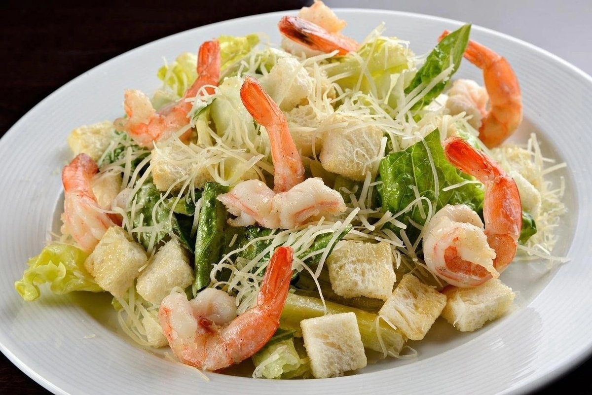 Ингредиенты: на 2 порции креветки 16-20 шт жидкий мед 1 ст л лимонный сок 2 ч л оливковое масло 1 ст л соль, перец по вкусу салат романо 1 пучок помидор 2 шт сыр пармезан 30 гр Для гренок: белый хлеб 2 ломтика чеснок 2 зубчика оливковое масло 2 ст л Для соуса: яйцо 1 шт оливковое масло 40 мл горчица 1/4 ч л лимонный сок 1 ч л Приготовление: Креветки вымыть, очистить и обсушить. Положить в миску, добавить мед, лимонный сок, оливковое масло, соль, перец по вкусу. Мариновать 30 минут. Разогреть сковороду с оливковым маслом. Обжаривать креветки по 2 минуты с каждой стороны. Чеснок очистить и измельчить, добавить оливковое масло и дать настояться час. Хлеб нарезать кубиками, поджарить на чесночном масле. Подсушить гренки в духовке. Для соуса отварить яйцо всмятку, разбить и выложить в миску. Добавить оливковое масло, горчицу, лимонный сок, взбить погружным блендером до однородной консистенции. Выложить на тарелку салатные листья, нарезанные помидоры, креветки, гренки