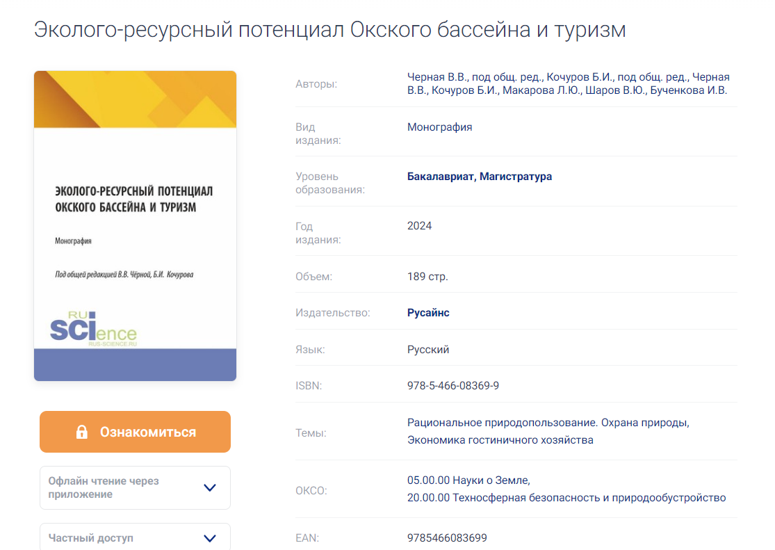 Монография «Эколого-ресурсный потенциал Окского бассейна и туризм»