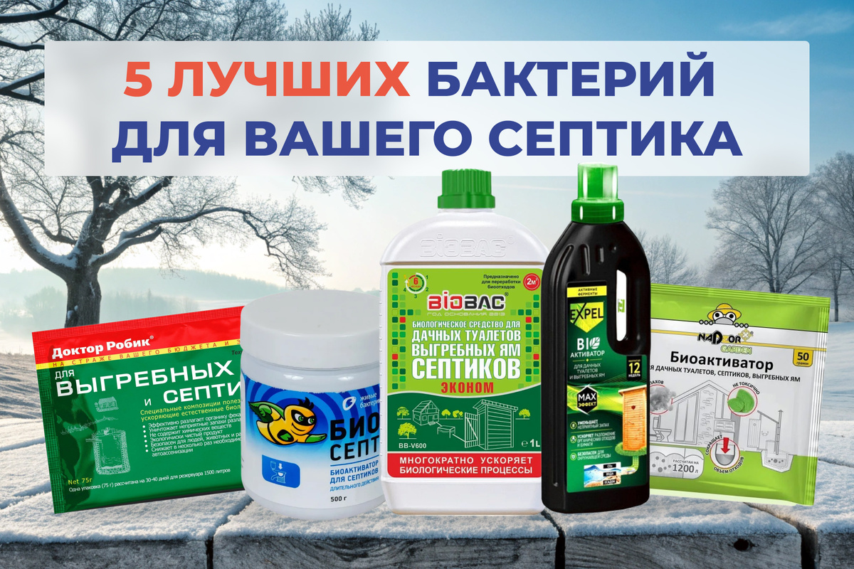 Все, у кого есть септик, знают, какие неприятности могут возникнуть, если не добавить в него бактерии. Одна из самых распространенных и раздражающих проблем — это резкий, неприятный запах, который может испортить любое пребывание на свежем воздухе. Но не переживайте! Мы поможем выбрать лучшие бактерии, чтобы избавить вас от этой головной боли. Представляем вам лучшие бактерии для септиков за 2024 год: Препарат «Доктор Робик 109» содержит микроорганизмы, которые эффективно разлагают бумагу, органические отходы, жиры, белки, целлюлозу, мочевину и крахмал. Его регулярное применение предотвращает образование плотных отложений и труднорастворимых органических остатков в септиках и выгребных ямах. Плюсы: Минусы: Стоимость: от 142 рублей. Универсальный препарат для септиков, содержащий комплекс бактерий и ферментов для ускорения процессов разложения органики. Рекомендуется использовать раз в полгода. Плюсы: Минусы: Стоимость: от 253 рублей. Этот биопрепарат выгодно выделяется отличным соотнош