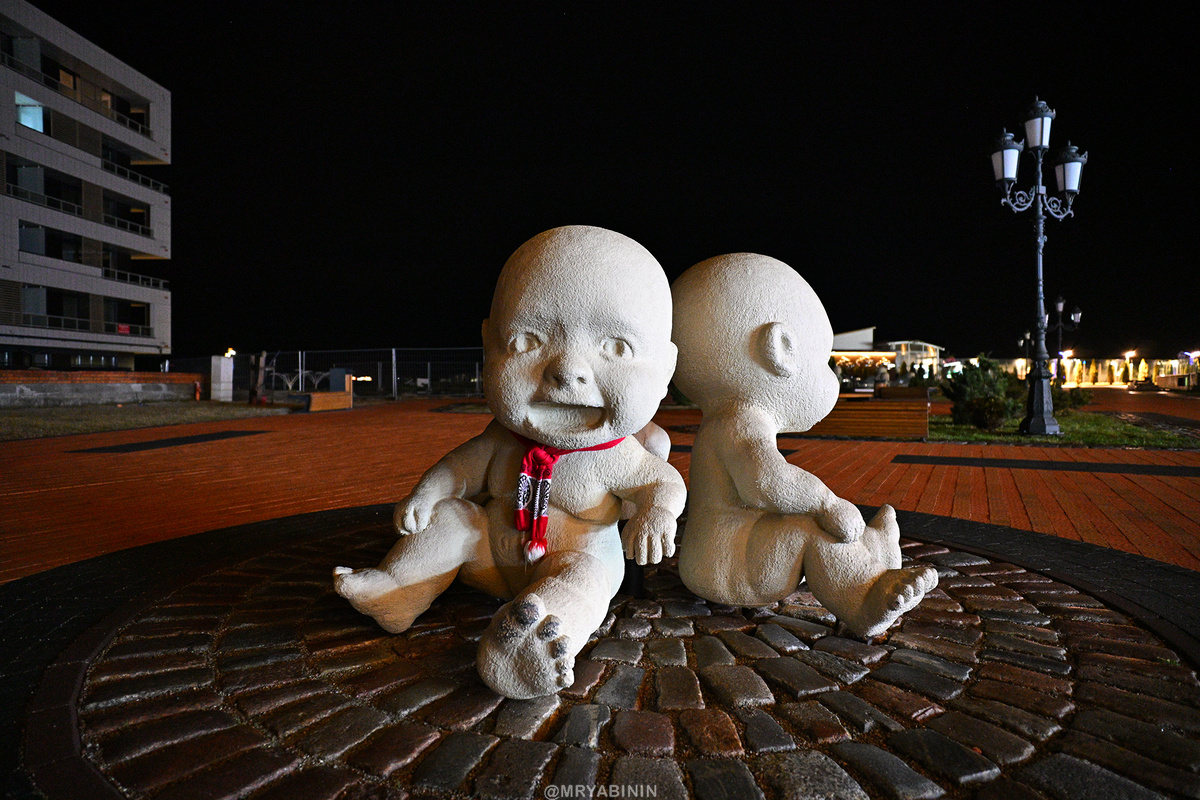 У нас появились новые пупсы! Нет, не эти наверху – им просто шарфик нацепили, а вот эти внизу, у которых еще рым-болты не выкрутили из разных мест, пока укладывают на новом месте обитания. Чувствую, что скоро будет целая армия пупсов окружать дом. Но мой самый любимый этот ⬇️. Идешь так ночью по дорожке, а тут из-за угла он… "Телефончик есть?!". Слабонервный человек может и разнервничаться. Это на фото пупс вытянут из тени, а в реальности жутковато в темноте выглядит. Фонтан не работает. Видимо поэтому туристов и нет. Где же им фоточки с пупсами делать?! Ни велосипедистов (что прям радует), ни пешеходов. Все замерзли и по дома разъехались. Балтийский зимний ветер уносит всех. Остаются только самые стойкие… и пупсы! На пляже тоже ни одного туриста. Идешь вдоль моря, слушаешь прибой и медитируешь... Гранд-отель наконец открылся. Столько лет стоял мрачной и безжизненной новостройкой, а теперь даже какие-то люди появились в окнах, все заработало, подсвечено гирляндами. На "ночном пляже" ти