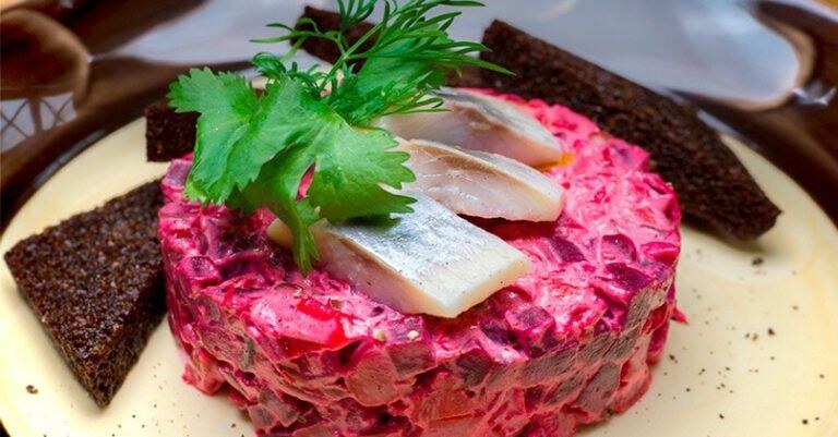 Сегодня мы разобрали, как приготовить простое и очень вкусное блюдо – винегрет с селедкой. Получилась хорошая закуска для взрослых и замечательный салат для детей. Подойдите к оформлению блюда творчески и обязательно украсьте его свежей зеленью.