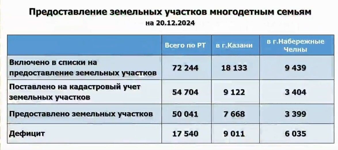 Сегодня Госсовет Татарстана единогласно проголосовал за внесение изменений в Земельный кодекс РТ, согласно которым многодетным семьям будут предоставляться земельные участки в других районах республики. Это необходимо, чтобы ликвидировать очередь из ожидающих эти наделы. Как отметили на заседании, в Набережных Челнах сложилась непростая ситуация – в городе более трех лет отсутствует динамика предоставления участков многодетным семьям. Более 6 тысяч семей не обеспечены землей. При этом необходимы более 900 га земли, которых в границах города нет. Раньше участки многодетным предоставлялись в Азьмушкино, Калмаше, Семекеево Тукаевского района. Проектом закона предусматривается возможность выделения участков еще в восьми близлежащих районах: Агрызском, Актанышском, Елабужском, Заинском, Менделеевском, Мензелинском, Муслюмовском и Сармановском. Резервы там есть. Это позволит полностью снять вопрос. Участки будут предоставлять в границах населенных пунктов –где есть необходимая инфраструктура