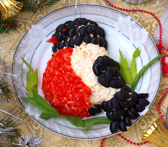 Салат, который создаёт праздничное настроение и сразу притягивает внимание гостей. Собирается легко и из простых ингредиентов: рис, курица, помидоры, маслины... Слои аккуратно укладываются, а декор превращает обычное блюдо в настоящее произведение искусства. Гости будут в восторге! Попробуйте, и пусть ваш стол станет самым праздничным в этом году!🎄✨ 🛒 ЧТО НАМ ПОНАДОБИТСЯ: 👩🍳 КАК ГОТОВИТЬ: 1. Отварите рис до мягкости и остудите. Куриное филе сварите или запеките, затем нарежьте мелкими кубиками. Лук мелко порежьте и, если хотите смягчить его вкус, обжарьте до золотистого цвета. Яйца сварите вкрутую, разделите на белки и желтки, натрите на тёрке. 2. На плоском блюде выложите рис в форме птички. Это будет основа. Смажьте её слоем майонеза. 3. Выкладываем куриное филе — это «тело» птички. Смазываем майонезом. Затем идёт слой лука, а сверху — желтки. Опять майонез. Завершаем белками, создавая «снежную» поверхность. 4. Декор — самое интересное. Нарежьте помидоры и выложите их на «грудку