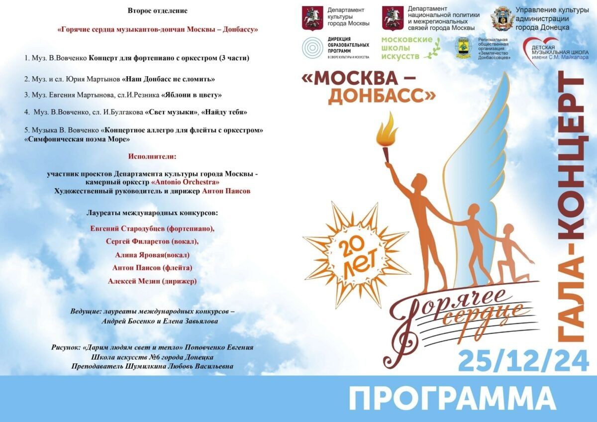 В камерном зале Московского Международного Дома Музыки 25 декабря 2024 года в 17:00 состоится заключительный гала-концерт XX фестиваля «Горячее сердце» – «Москва-Донбасс». Это уникальный проект, в рамках которого финалисты отборочного тура ежегодно приезжают в Москву для участия в заключительном концерте равных возможностей «Москва – Донбасс». Грандиозный Гала-концерт «Москва – Донбасс» 25 декабря совместит в себе целый калейдоскоп направлений искусства. В первом отделении учащиеся московских и донецких школ искусств исполнят музыку известных композиторов на фортепиано, скрипке, саксофоне, кларнете, баяне и домре, споют народные и эстрадные песни, представят хореографические постановки. Выступят известные творческие коллективы из города Москвы: хор «Мелодия» ДМШ им.С.М. Майкапара (руководитель Евгения Борисовна Кудрическая), Городской ансамбль балалаечников учащихся московских школ искусств (руководитель Юрий Юриевич Стрежилинский), коллектив хореографического училища при театре танца