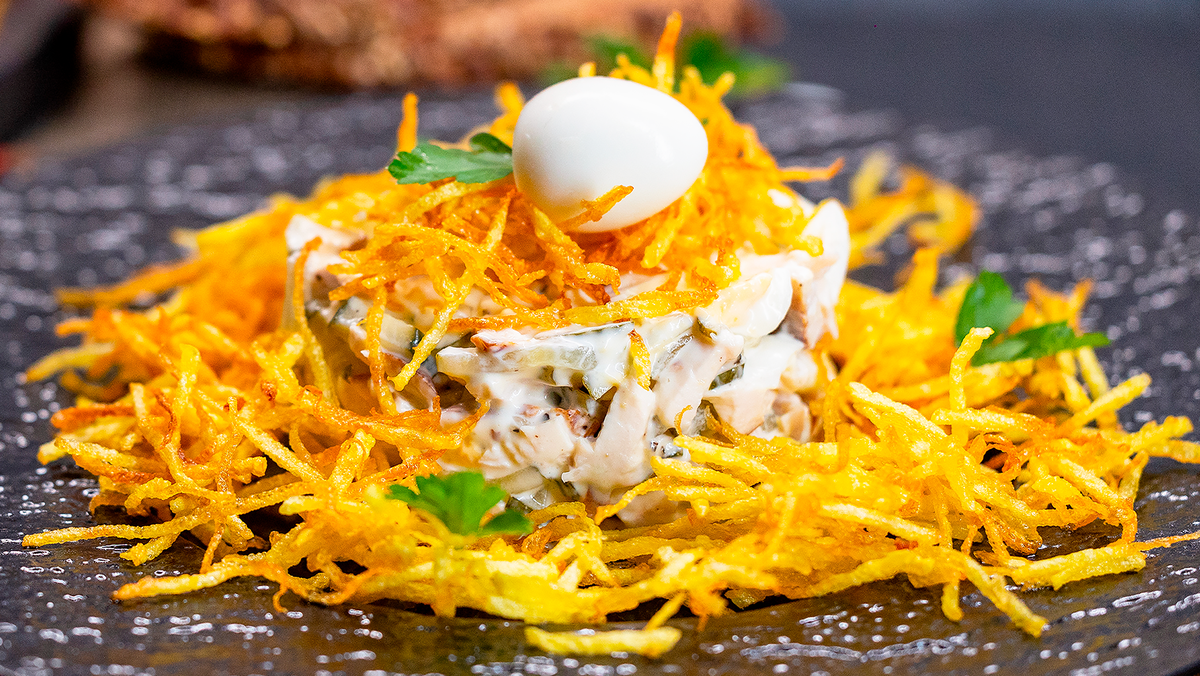 Этот салат идеально подходит для новогоднего застолья! Хрустящий картофель, нежные перепелиные яйца, ароматная копченая курочка и соленые огурчики — сочетание разных вкусов и текстур делает блюдо сытным и очень аппетитным. А еще оно славится необычной подачей, от которой будут в восторге ваши близкие! • Перепелиные яйца – 7 шт.