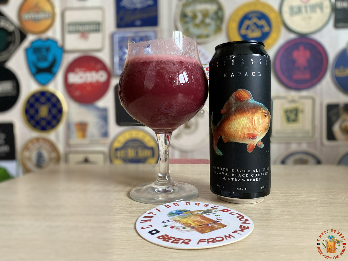 Пивной напиток "Сергакор Карась" непастеризованный нефильтрованный неосветленный (алк.5,0% пл.20%). Объём: 0,5 л. В составе: вода подготовленная "исправленная", солод пивоваренный ячменный светлый, пюре розовой гуавы, пюре клубники, пюре черной смородины, сок черной смородины, солод пивоваренный пшеничный, хмель, дрожжи пивные. Изготовитель: ООО "СОЛАР БИР" г. Подольск
