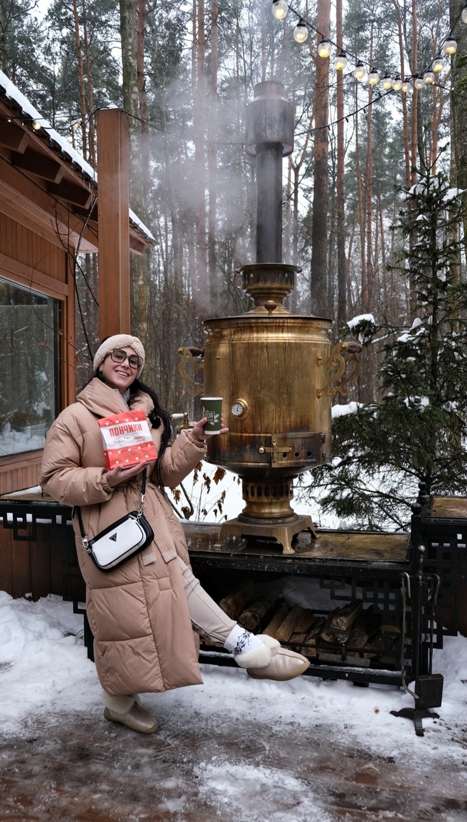 Я как будто оказалась в настоящей лесной сказке. Домик окружен высокими хвойными деревьями, придающими месту особую магию. Рядом с домом стоит массивный самовар, из которого поднимается густой пар, наполняя пространство ароматом чая. Внутри кафе деревянные столики с мягкими креслами, где можно удобно устроиться и отдохнуть. Стены, украшенные декоративными веточками и живыми растениями создают тёплую и располагающую атмосферу.
