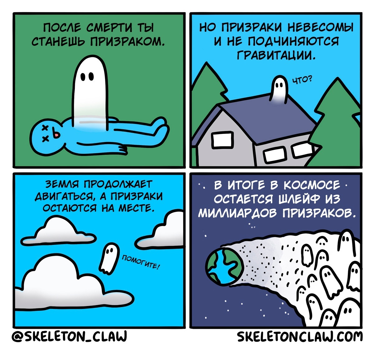 В этом блоге довольно часто появляются комиксы про призраков - как минимум потому, что я регулярно выкладываю здесь новые выпуски своей серии комиксов «Почти 100 привидений», которая полностью посвящена этой теме. Но, естественно, я далеко не единственный автор комиксов, который рисует что-то про привидений. И сегодня я как раз решил собрать для вас десятку отличных зарисовок про призраков от самых разных художников. Надеюсь, что вам понравится! Серия Skeleton Claw («Костлявая рука»), созданная художником по имени Энди (Andy) - это небольшие истории на самые разные темы. Автор проекта любит черный юмор и неожиданные повороты сюжета. К примеру, в одном из своих комиков Энди решил выдвинуть интересную теорию о том, как именно могла бы выглядеть загробная жизнь. А американский художник Зак Крэнор (Zach Cranor) - автор серии Last Place Comics («Последнее место») - любит закрученные сюжеты, наполненные отсылками к современной поп-культуре. Героями его комиксов становятся маги, супергерои, д