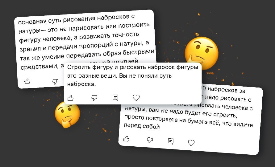 В этой мини статье мне хотелось бы отойти от обсуждения терминологии и поговорить о кое-чем, на мой взгляд, более важном. Поэтому короткая оговорка: я считаю наброски и скетчи синонимами, и считаю, что и то, и другое может быть Все зависит от цели, способа рисования и ожидаемого результата. Например, наброски с натуры делать полезно, чтобы развивать пространственное мышление и уметь схватывать самое важное взглядом; наброски с референсов открывают 90% недоступных с натуры объектов и позволяют рассмотреть детали. Я вижу распространенное мнение, что практика набросков - это исключительно практика рисования с натуры "от контура". Иначе говоря, что видишь, то и рисуешь. Такой способ имеет место быть - он прокачивает пропорции и динамику линии, учит схватывать фигуру быстро. НО За годы практики я сделала вывод, что этот способ эффективен только в одном случае: если вы уже знакомы с анатомией и построением. Если же вы делаете наброски исключительно от контура, не зная, как этот же объект пос