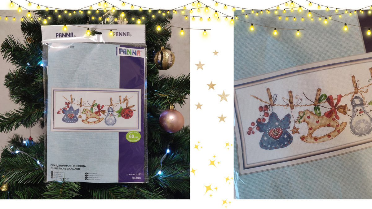 Сюжет мне понравился тем, что он яркий и праздничный. На нем изображена новогодняя гирлянда, которая предполагает украшение дома к празднику. На гирлянде висят игрушки ангела, лошадки, звездочки, лампы-снеговика и обычной елочной игрушки в виде шарика. Сюжет не объемный, о чем я смею предположить, что гирлянда собрана из игрушек, вышитых на пластике. Кстати, элементы сюжета можно смело вышивать на пластиковой основе, чем не альтернатива? Этими вышитыми на пластике игрушками можно украсить как елку, так и смастерить подобную гирлянду и украсить ею свой милый дом к празднику. Лично я не вижу вышитые на пластике игрушки на своей елке, да и вышивать на пластике не люблю, но, если я когда-нибудь осмелюсь освоить пластик, то обязательно вышью нечто подобное!