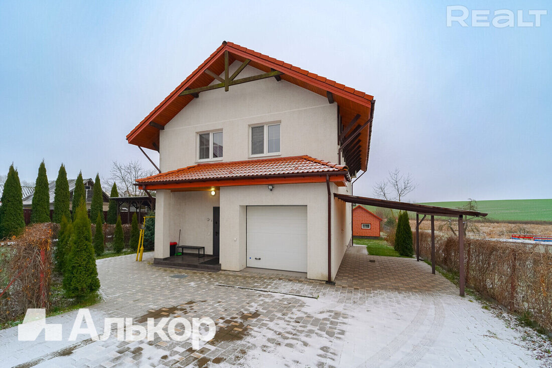 Практически сразу за МКАД, в Колядичах, продается современный дом с чистовой отделкой и мебелью. По стоимости квадратного метра он сравним с минскими квартирами, но по остальным параметрам явно побеждает – есть терраса, свой участок, парковка, гараж и погреб. Мало? На заднем дворе еще и гостевой домик есть. Узнали, за сколько все это хозяйство можно купить. Дом находится в коттеджной застройке Колядич, в стороне от промышленной зоны. До выезда на МКАД – 1,3 километра, до ближайшей станции метро «Слуцкий гостинец» – 3,5 километра. То есть, это практически Минск. Дом здесь двухэтажный, со встроенным гаражом, подвалом и террасой. Построен в 2014 году, выглядит свежо и вполне современно. Стены у него из керамзитобетона, на крыше – металлочерерпица, окна ПВХ. Общая площадь – 156 квадратов. На первом этаже находится гараж с подвальчиком и выходом в прихожую. Рядом с прихожей – помещение котельной, которое совмещает функцию санузла. Проходим дальше и попадаем в общее пространство кухни-столов