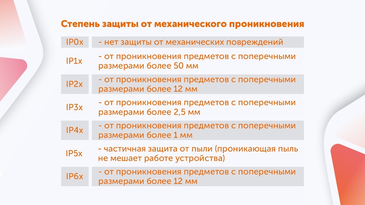 Назначение видеокамеры наблюдения, кроме в ранее приведенных характеристик, определяется ее конструктивным и климатическим исполнением. Все видеокамеры наблюдения можно разделить на две большие группы: для внутренней и наружной установки. При этом внутренняя установка предполагает сухое отапливаемое помещение. Широко встречаются промежуточные варианты. Например, в производственных и складских помещениях часто встречаются особо пыльные, холодные и влажные условия. В этом случае рационально применять камеры для наружной установки с соответствующей защитой от пыли, влаги и низкой температуры. В ниже приведенных таблицах 1 и 2 указаны расшифровки стандарта IP пыле и влагозащиты Первая цифра стандарта IP: защита от механического проникновения Таблица 1 Вторая цифра стандарта IP: защита от проникновения внутрь корпуса влаги или воды