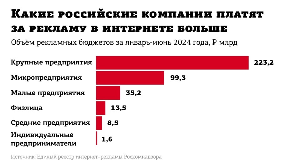 По данным Ассоциации развития интерактивной рекламы в России (АРИР), 2024 год для рынка интерактивной рекламы и продвижения в интернете отмечен хорошей динамикой. Притом что 2023-й уже был рекордным: установлен исторический максимум по объёму, который достиг 55%, составив 807 млрд рублей. Инвестиции в традиционные сегменты — branding- (баннеры, видео) и performance-рекламу (поисковая, контекстная, таргетированная, Mobile In-App и в соцсетях) — увеличились на 32%. Однако только в первом полугодии 2024-го этот сегмент прибавил 29% по сравнению с аналогичным периодом 2023 года, подсчитали в АРИР. Вложения составили 242 млрд рублей (без НДС).