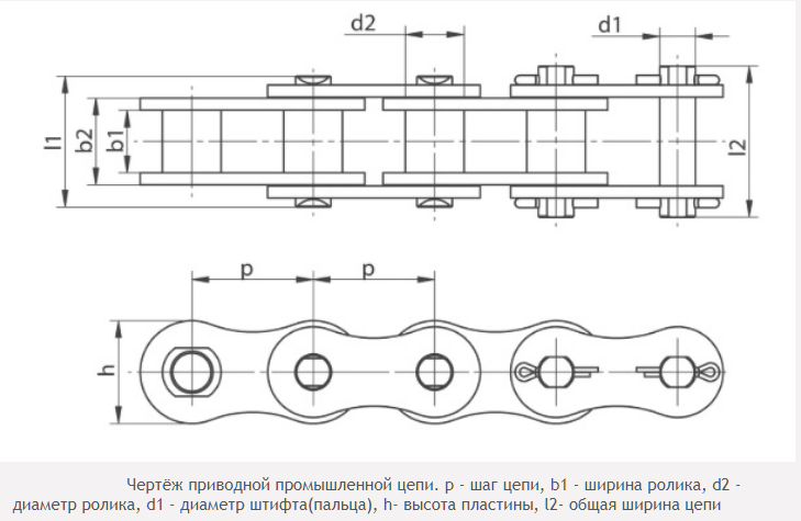 Как подобрать приводную роликовую цепь! Для определения стандартной втулочно-роликовой цепи необходимо замерить: 1) p шаг цепи – расстояние между центрами ближайших штифтов. 2) b1 ширину ролика цепи или расстояние между внутренними пластинами цепи. 3) d2 диаметр ролика. 4) толщину пластины. После замеров размеров можно легко подобрать цепь посмотрев https://xn--b1aekzcfb0c.xn--p1ai/catalog/tsepi_privodnye/tsepi_privodnye_rolikovye_pr_gost_13568_97/ Дополнительно необходимо учитывать, что помимо стандартных приводных цепей, существуют следующие подвиды: 1) Цепи с прямыми пластинами. 2) Цепи с полыми штифтами (Валиками). 3) Нержавеющие цепи. 4) Приводные цепи с покрытиями. 5) А также, стандартные приводные цепи с различными прикреплениями (Атачментами) в виде полок, удлинённых штифтов, накладок и др. Обозначение цепей. Цепи по европейскому стандарту ISO / DIN маркируются: 05В-1, 06В-1, 08В-1, 10В-1, 12В-1, 16В-1, 20В-1, 24В-1, 28В-41, 32В-1, 40В-1, 48В-1. Пример обозначения: 12В-2 DIN/I