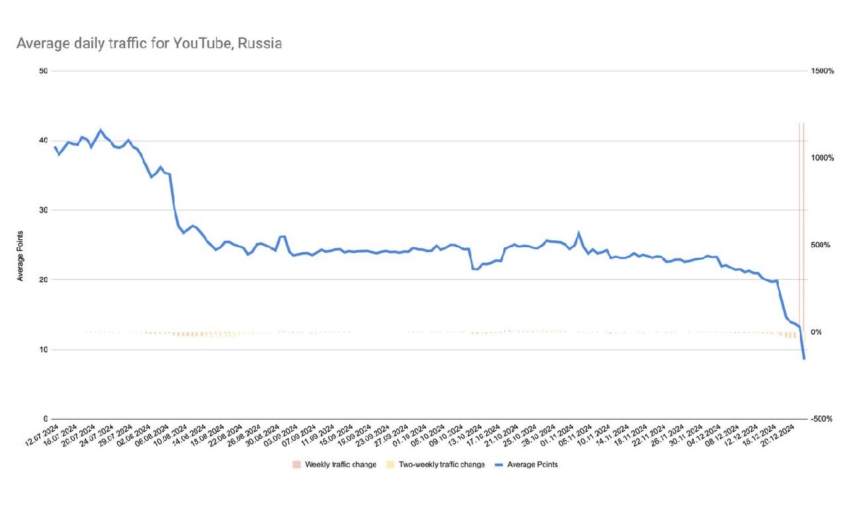 Сегодня многие СМИ и Телеграм-каналы сообщают о фактической блокировке YouTube в России. Объем трафика в нашей стране упал до значений, схожих с окончательной блокировкой. По данным сервиса мониторинга Google, трафик YouTube в России достиг значения 8,5 балла. До начала замедления он составлял 40 баллов. Таким образом, к сегодняшнему дню количество просмотров снизилось до 21,25% от нормального значения. Артем Геллер, эксперт комиссии по развитию информационного общества Совета Федерации и разработчик сайта Кремля, прокомментировал сложившуюся ситуацию. На вопрос, можно ли считать YouTube полностью заблокированным, он ответил: «И да, и нет». Как он отметил, Роскомнадзор «сообщает де-факто, что идет процесс замедления». По словам эксперта, сейчас остается все меньше и меньше лазеек, позволяющих использовать платформу. Напомним, что замедление YouTube в России началось в июле этого года. Уже к концу августа среднее время посещения YouTube в нашей стране сократилось с 52 до 38 минут. К сер
