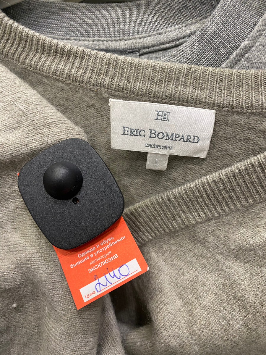 - Еще один свитер неопознанного бренда, часть названия кто-то вырезал, по качеству он 1в1 похож на первые два 👆я бы предположила, что это тоже Эрик Бомпард, просто куплен в разные годы, поэтому другой дизайн бирок. Ну и состав на внутренних сначала указан на французском. Та же модель и явно один хозяин 😁, висел в женском отделе «эксклюзив», но он мужской). На этом были пятна на рукавах и хорошо потертые локти, правда, не до дыр, как у серо-бежевого. Оценили его в 2120.