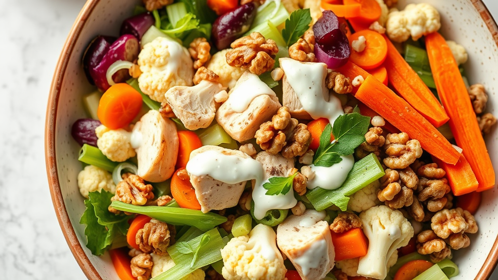 Праздничный салат «Марго». Вкусный и очень нежный Салат «Марго» — это не просто блюдо, это настоящая кулинарная симфония, которая расцветает яркими цветами на вашем столе. Он станет идеальным аккомпанементом к праздничным вечерам, семейным торжествам или дружеским встречам. Каждая ложка приносит наслаждение, напоминающее о тёплых летних днях, когда все собираются за одним столом, а смех и разговоры наполняют дом уютом и светом. Ингредиенты 300 г куриного филе — нежное мясо, которое обладает удивительным вкусом и отлично сочетается с другими ингредиентами. 150 г цветной капусты — яркий цвет и хрустящая текстура, собранная с локальных полей. 100 г стеблей сельдерея — придаёт свежесть и лёгкую пряность. 1 большая морковь — сладкий и яркий акцент, который добавляет красок. 150 г грецких орехов — хрустящие дары природы, богатыми полезными свойствами. 200 г йогурта — для заправки; выбирайте натуральный, без добавок, чтобы сохранить насыщенный вкус. Соль и перец по вкусу — для завершения вкус
