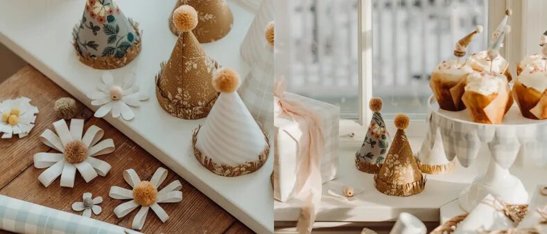Вырежьте круг и разрежьте его посередине так, чтобы у вас получилось две равные половинки. Теперь основа для колпака готова. Сверните из получившейся детали конус и с помощью клеевого пистолета или скотча склейте его, прижимая руками, чтобы получилась форма, которая вам нравится. Отрежьте верхнюю часть шляпы и прикрепите к ней помпон из ниток или ткани. Чтобы украсить край колпачка, отрежьте из обоев ленту подлиннее, которой будет достаточно, что бы обернуть весь нижний край, высота может составлять около 2 см. Нарежьте бахрому с одного края ленты (оставьте около 1 см) и приклейте его с помощью клеевого