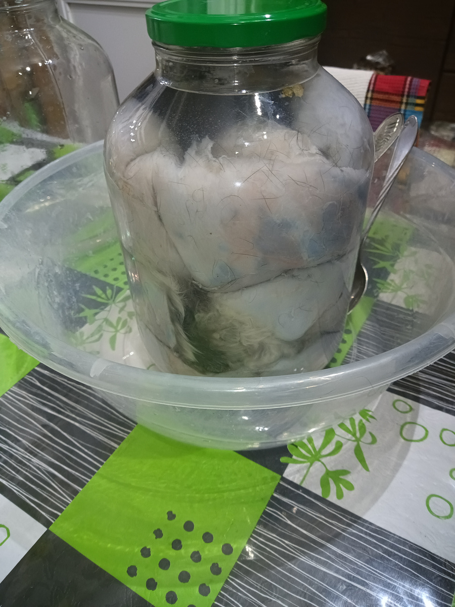 Предисловие. У меня получилось так, что шкурки принесли неожиданно, и пришлось в быстром темпе искать все необходимое. Понятно, что уксус, соль, хозяйственное мыло всегда есть в хозяйстве. Причем, в рецепте не указано, какой брать уксус. Уксус берется в рецепте столовый (НЕконцетрированный)!!! Если брать концентрированный уксус, то нужно выполнить пересчет.