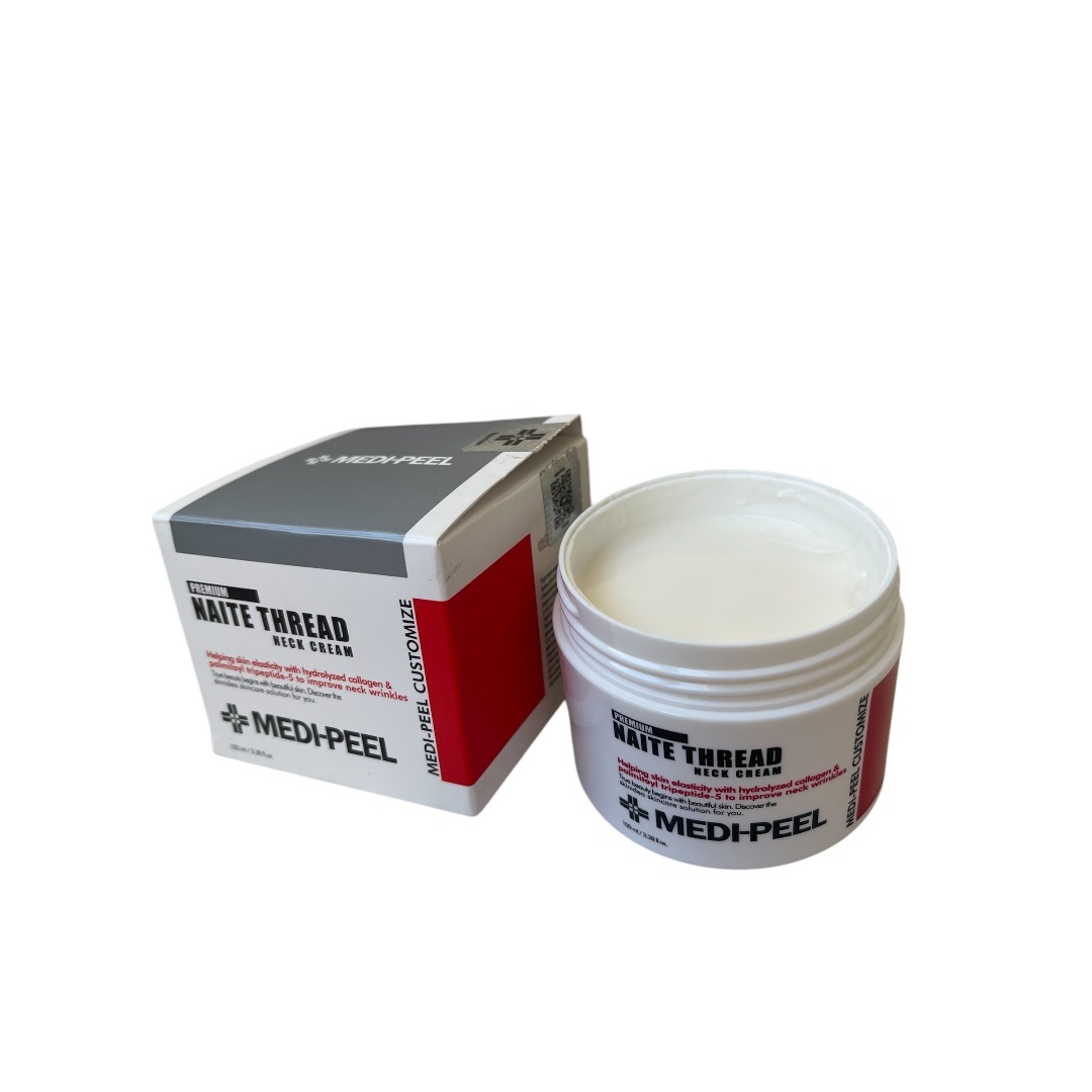 Моделирующий крем для шеи и зоны декольте от корейского бренда Medi-peel Naite thread neck cream это бестселлер. Сразу скажу, что данный продукт появился в виде стика, пользоваться им удобней. Быстрее всего у нас стареет шея и руки, поэтому про эти зоны не забываем. Упаковка, банка находится в картонной коробочке с фирменной голограммой-защитой от вскрытия и лаконичным аптечным дизайном, банка большая, из белого пластика с откручивающейся крышкой, есть дополнительная пластиковая мембрана, объем целых 100 мл, хватит надолго. Для пробы можно взять мини версию. Минус-нет лопаточки. Крем белого цвета и очень необычной консистенции, мне очень напомнил густой крем ПВА, он тоже тягучий, даже немного запахом. Распределяем тонким слоем массажными движениями, впитывается быстро без пленки и липкости и сразу смягчает и питает зону шеи и декольте. Кольца Венеры полностью не уберет (только колем), слишком глубокие заломы, но ситуацию точно улучшит и хорошо работает над тонусом кожи. Состав прек