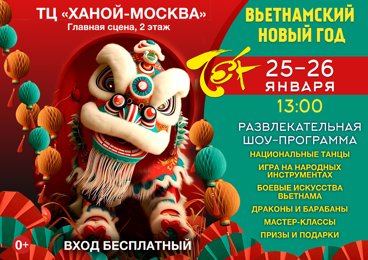 25 и 26 января в ТЦ «Ханой-Москва» состоится грандиозный вьетнамский фестиваль в честь празднования восточного нового года Тет! Он будет организован в полном соответствии с национальными традициями этой удивительной страны. Два дня на главной сцене самого аутентичного торгового центра столицы развернется представление, главным действующим лицом которого выступит вьетнамский дракон. Красочное шоу барабанов, танец льва, колоритные выступления вьетнамских артистов и школы боевых искусств, мастер-классы по изготовлению игрушек тохе и символа года змеи – здесь будет все, чтобы прикоснуться к традициям удивительного Вьетнама! Вход бесплатный. Главная сцена, 2 этаж. Адрес: Москва, Ярославское шоссе, дом 146, корпус 1