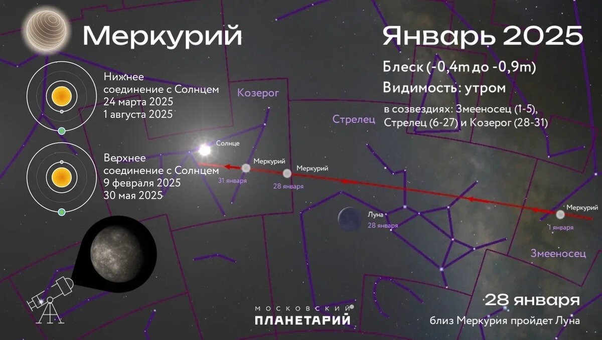Друзья, в 2025 году каждый месяц мы будем рассказывать самое интересное о планетах на инфокартинке. На ней будут отражены важные моменты для каждой из планет в данном месяце: ⭐️ По каким созвездиям движется планета в течение месяца. Красной линией будет обозначен путь движения планеты по созвездиям (в центре рисунка). ⭐️ Видимость планеты. В какое время суток можно наблюдать планету (вечер, ночь. утро) или она будет не наблюдаема (вблизи соединения с Солнцем). ⭐️ Блеск планеты (звездная величина (+-0,0m)) и его изменение в течение месяца. ⭐️ Соединение и противостояние планеты с Солнцем в 2025 году. Зная эти даты, вы легко сможете определить, когда наблюдать планету. Наилучшее время для наблюдения планеты – это месяц до и после ее противостояния (для далеких планет). В период противостояния планета наблюдается высоко над горизонтом в полночь как яркое светило (Марс, Юпитер и Сатурн). Для Меркурия и Венеры лучшее время для наблюдения – это моменты их наибольшего удаления от Солнца (эло