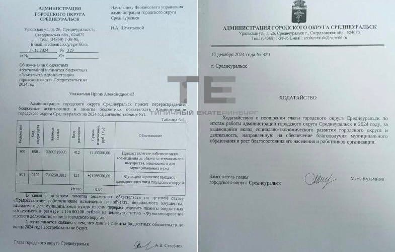 В telegram-каналах распространили два документа. В первом говорится, что мэр Среднеуральска Алексей Стасенок якобы попросил начальника городского финуправления Ирину Шулятьеву перевести неизрасходованные бюджетные деньги — 1,2 млн рублей, выделенные на закупку жилья для нуждающихся, на статью расходов «по функционированию главы города» — то есть самого себя. Во втором выложенном документе заммэра Мария Кузьмина просит выписать Алексею Стасенку премию «за выдающийся вклад в социально-экономическое развитие городского округа». В Сети писали, что якобы как раз на названную в первом документу сумму. Но в самом ходатайстве она не прописана и адресат тоже не указан. Алексей Стасенок заявил корреспонденту 66.RU, что опубликованная информация — фейк. «Никакую премию мне не выписывали. Также хочу обратить внимание, что вопрос на заседание думы не выносили, в повестке и протоколе заседания его нет. Без решения депутатов ни глава, ни заместители выписывать мне премию не могут», — объяснил он. В к