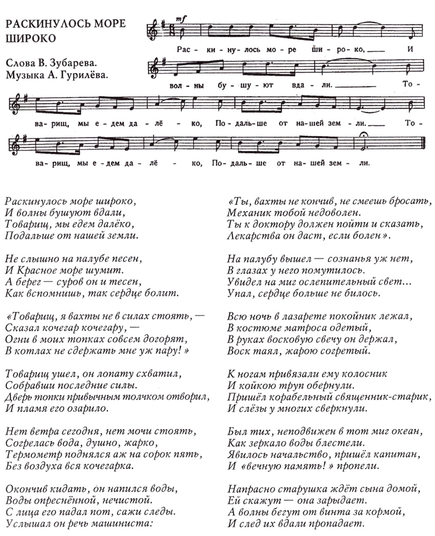 Как любая народная песня, это музыкальное произведение существует во множестве вариантов. На рисунке приведён, так сказать, «канонический» вариант текста. Внимательно прочитаем текст песни. Из упомянутых в нём некоторых сведениях о составе команды можно сделать однозначный вывод, что события происходят на крупном военном корабле, в дореволюционное время. Только на броненосцах и крейсерах были одновременно и врач, и священник (на броненосце врачей могло быть и двое). На гражданских (коммерческих) судах того времени, как правило ни врача, ни священника не было. То же можно сказать и о малых военных кораблях, типа миноносцев. Корабль в песне имеет паровую машину и винтовой движитель (след винта за кормой). События происходят в Красном море. Кроме того, корабль этот – достаточно старой постройки, поскольку не имеет механизма углеподатчика, так называемого «стокера» («товарищ ушёл, он лопату схватил, собравши последние силы»).