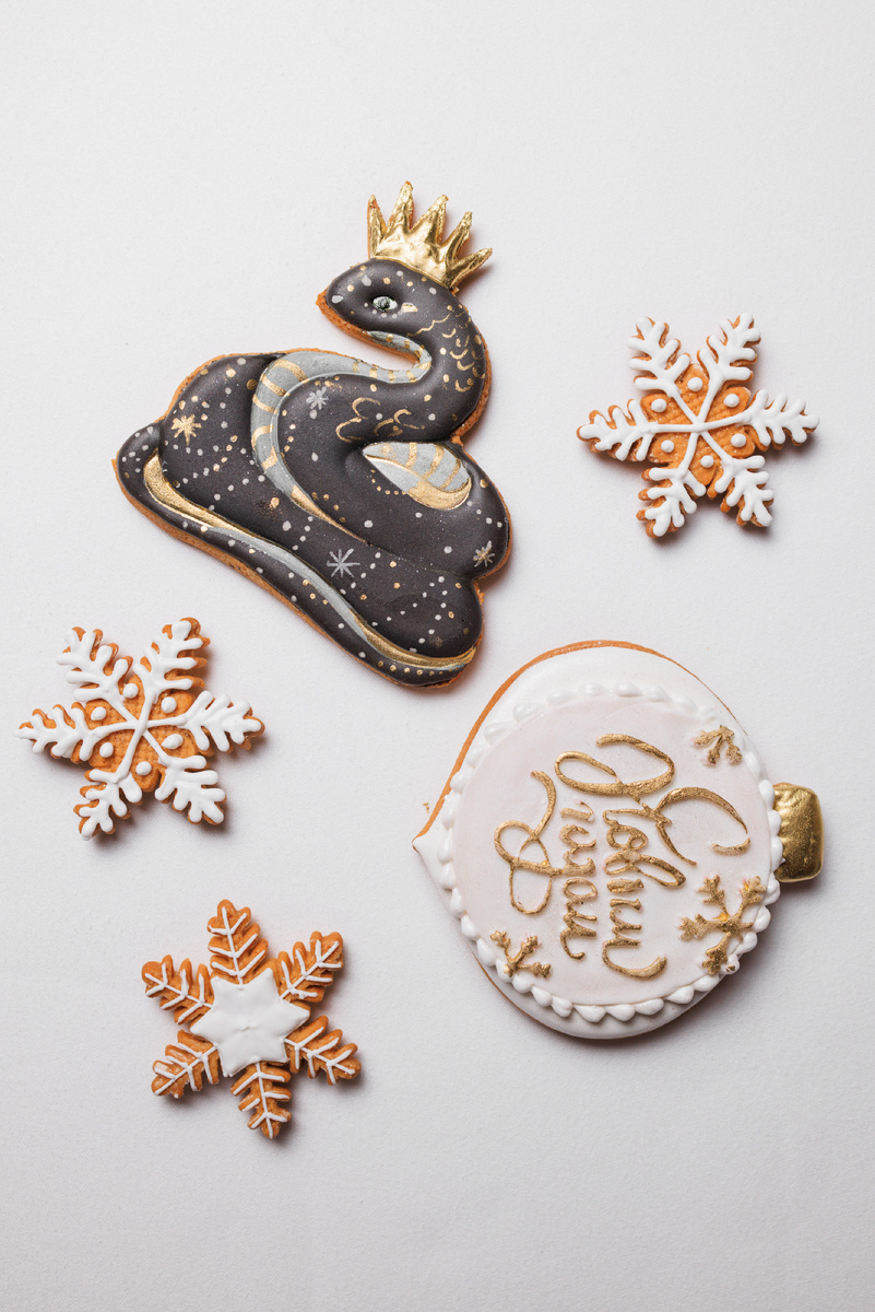 Еще одним воплощением главной героини наступающего года стало фигурное печенье в виде Змейки Счастья – шоколадно-кардамоновое сабле с кремом из белого шоколада, ананаса и мадагаскарской ванили.