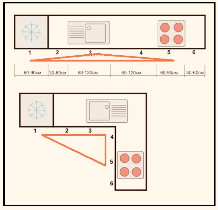Основные принципы метода заключаются в следующем: холодильник, плита и раковина образуют вершины треугольника, а расстояние между ними должно быть минимальным. Это позволяет сократить время и силы, затрачиваемые на приготовление еды.